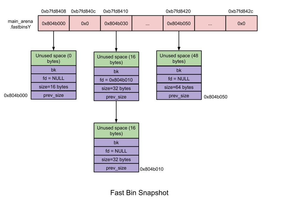 例如,第一个fast bin(index 0)包含16字节chunk的binlist,第二个fast bin(index 1)包含24字节chunk的binlist …