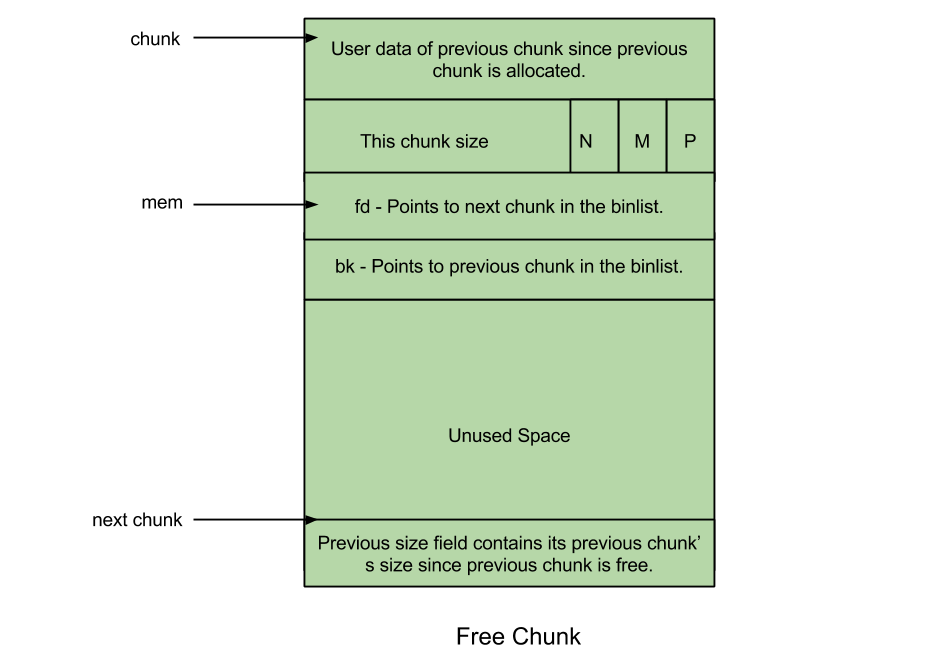 - PREV_INUSE(P) - 前一个chunk被分配时,设置这一位。