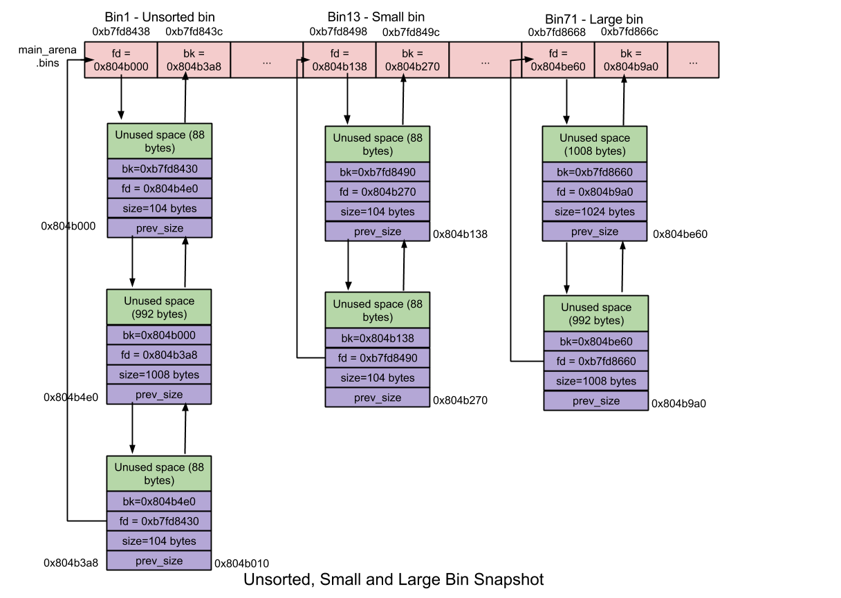 例如,第一个small bin(Bin 2)保存一个16字节chunk的binlist,第二个smallbin(Bin 3)保存一个24字节chunk的binlist …