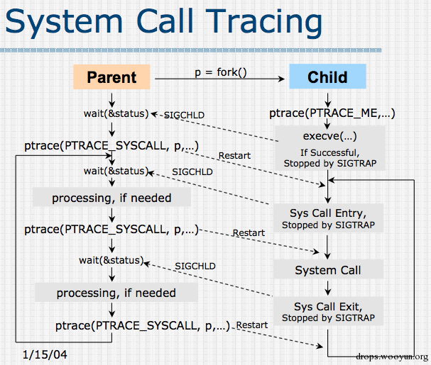 1 2 3 4 5 6 7 8 9 10 11 12 13 14 15 16 17 18 19 20 21 22 23 24 25 26 27 int main (int argc, char *argv[]) { if (argc != 2 ) { printf ("Usage: %s <pid to be traced>\n" , argv[0 ]); return 1 ; } pid_t pid; int status; pid = atoi(argv[1 ]); if (0 != ptrace(PTRACE_ATTACH, pid, NULL , NULL )) { printf ("Trace process failed:%d.\n" , errno); return 1 ; } ptrace(PTRACE_SYSCALL, pid, NULL , NULL ); while (1 ) { wait(&status); hookSysCallBefore(pid); ptrace(PTARCE_SYSCALL, pid, NULL , NULL ); wait(&status); hookSysCallAfter(pid); ptrace(PTRACE_SYSCALL, pid, NULL , NULL ); } ptrace(PTRACE_DETACH, pid, NULL , NULL ); return 0 ; }
