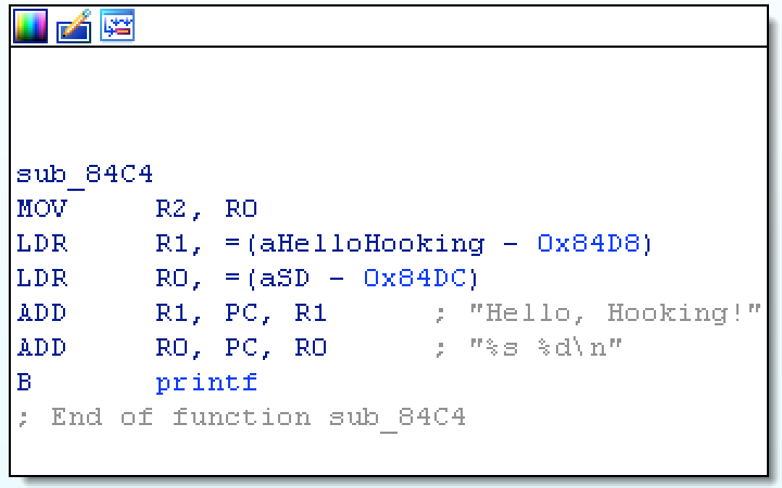 1 2 3 4 5 6 7 8 void hook_precall (struct hook_t *h) { int i; for (i = 0 ; i < 3 ; i++) ((int *)h->orig)[i] = h->store[i]; hook_cacheflush((unsigned int )h->orig, (unsigned int )h->orig+sizeof (h->jump)*10 ); }