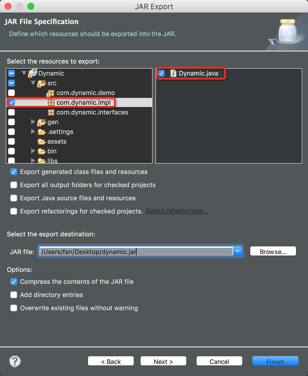 将上面开发好的动态类打包成jar,这里要注意的是只打包实现类Dynamic.java,不打包接口类IDynamic.java