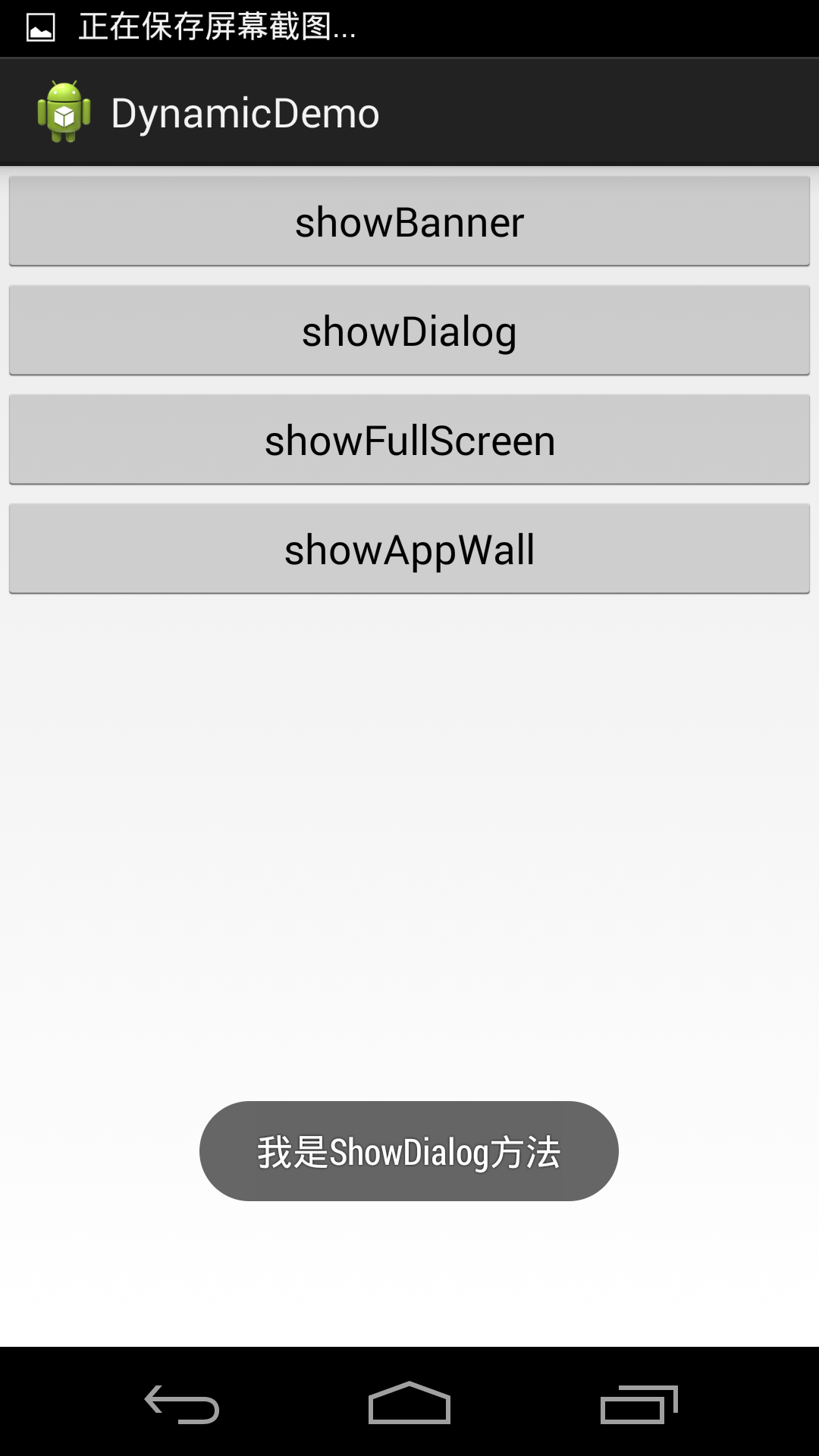 public class Dynamic implements IDynamic { private Activity mActivity; @Override public void init(Activity activity) { mActivity = activity; } @Override public void showBanner() { Toast.makeText(mActivity, "我是ShowBanner方法", 1500).show(); } @Override public void showDialog() { Toast.makeText(mActivity, "我是ShowDialog方法", 1500).show(); } @Override public void showFullScreen() { Toast.makeText(mActivity, "我是ShowFullScreen方法", 1500).show(); } @Override public void showAppWall() { Toast.makeText(mActivity, "我是ShowAppWall方法", 1500).show(); } @Override public void destroy() { } }