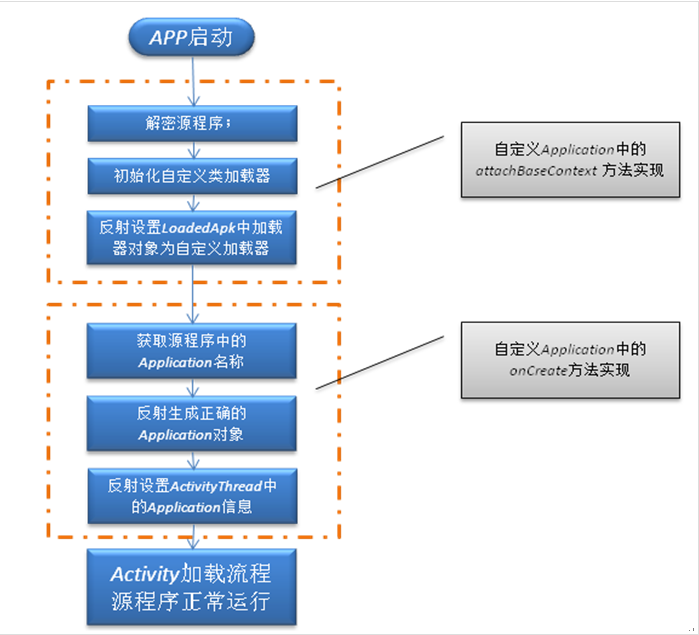 - 得到壳程序APK中的DEX文件,然后从这个文件中得到源程序APK进行解密、加载 这里需要注意的一个问题,就是我们需要找到一个时机,就是在壳程序还没有运行起来的时候,来加载源程序的APK,执行它的onCreate方法,那么这个时机不能太晚,不然的话,就是运行壳程序,而不是源程序了。查看源码我们知道。Application中有一个方法:attachBaseContext这个方法,它在Application的onCreate方法执行前就会执行了,所以我们的工作就需要在这里进行。