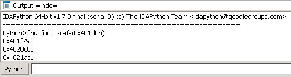 1 2 for addr in XrefsTo(0x00405bf0 , flags=0 ): print hex (addr.frm)