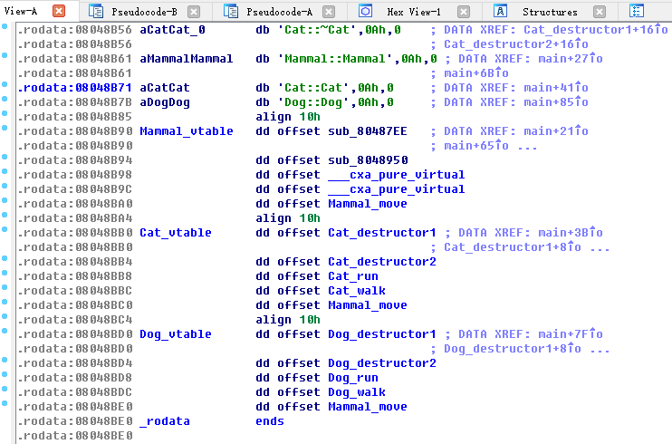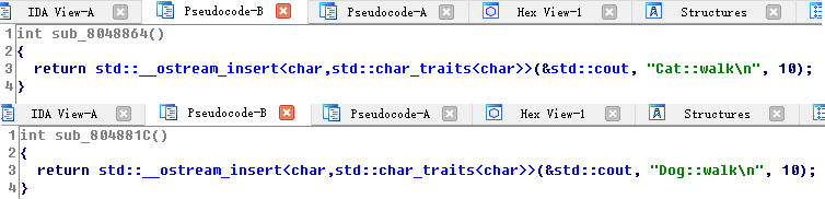 三个虚表的第四项分别是sub_8048864、sub_804881c和__cxa_pure_virtual。前两个函数如上图所示,分别是Dog和Cat类中对walk函数的实现,最后一个函数就是Mammal类中对应的实现。因为Mammal类中没有定义walk的具体实现,而是声明其为纯虚函数。那么GCC就插入了一个默认的项目。现在就知道了虚表1是Mammal类的,2是Cat类的,3是Dog类的。
