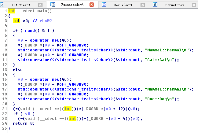 通过以上的分析,我们知道了,动态类型可能是Cat或者Dog,我们也知道了如何通过查看虚表的项目,来判断哪个函数会被调用,这是C++虚函数逆向的第一步。后面会介绍如何处理更多、更复杂的二进制程序和继承关系。