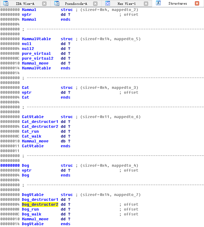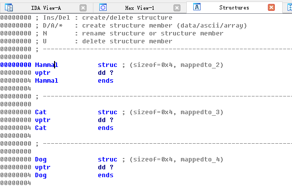 为了研究方便,我们定义了几个结构体。刚才我们已经分析了Mammal、Cat和Dog的成员只有vptr,因此如下定义三个结构体: