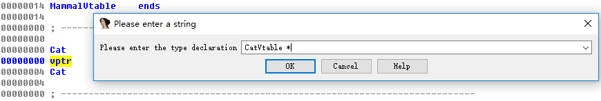 接着,修改类中虚指针的类型为指向对应虚表的指针。比如,Cat类的vptr成员,修改为CatVtable *类型。(修改类型:光标放在变量名上按y)