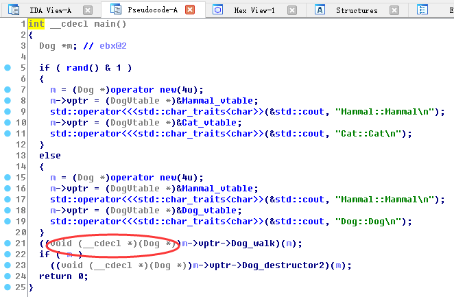 上图是把m的类型修改为Dog *,也可以修改为Cat *,可以看到21行调用了相应的函数。