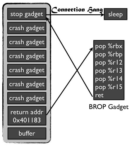 一般情况下,如果我们把栈上的return address覆盖成某些我们随意选取的内存地址的话,程序有很大可能性会挂掉(比如,该return address指向了一段代码区域,里面会有一些对空指针的访问造成程序crash,从而使得攻击者的连接(connection)被关闭)。但是,存在另外一种情况,即该return address指向了一块代码区域,当程序的执行流跳到那段区域之后,程序并不会crash,而是进入了无限循环,这时程序仅仅是hang在了那里,攻击者能够一直保持连接状态。于是,我们把这种类型的gadget,称为stop gadget,这种gadget对于寻找其他gadgets取到了至关重要的作用。