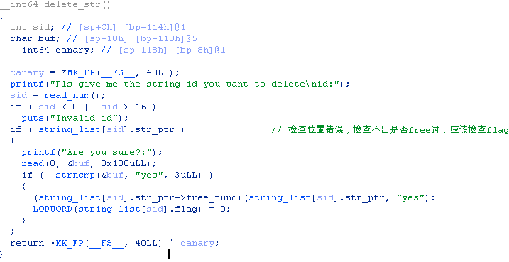 漏洞发生在delete_str函数中,在delete时没有检查这块内存是否被释放过,造成double free。