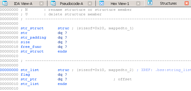 str_struct是漏洞利用所用到的结构体,每次创建字符串都会malloc一个这个结构。