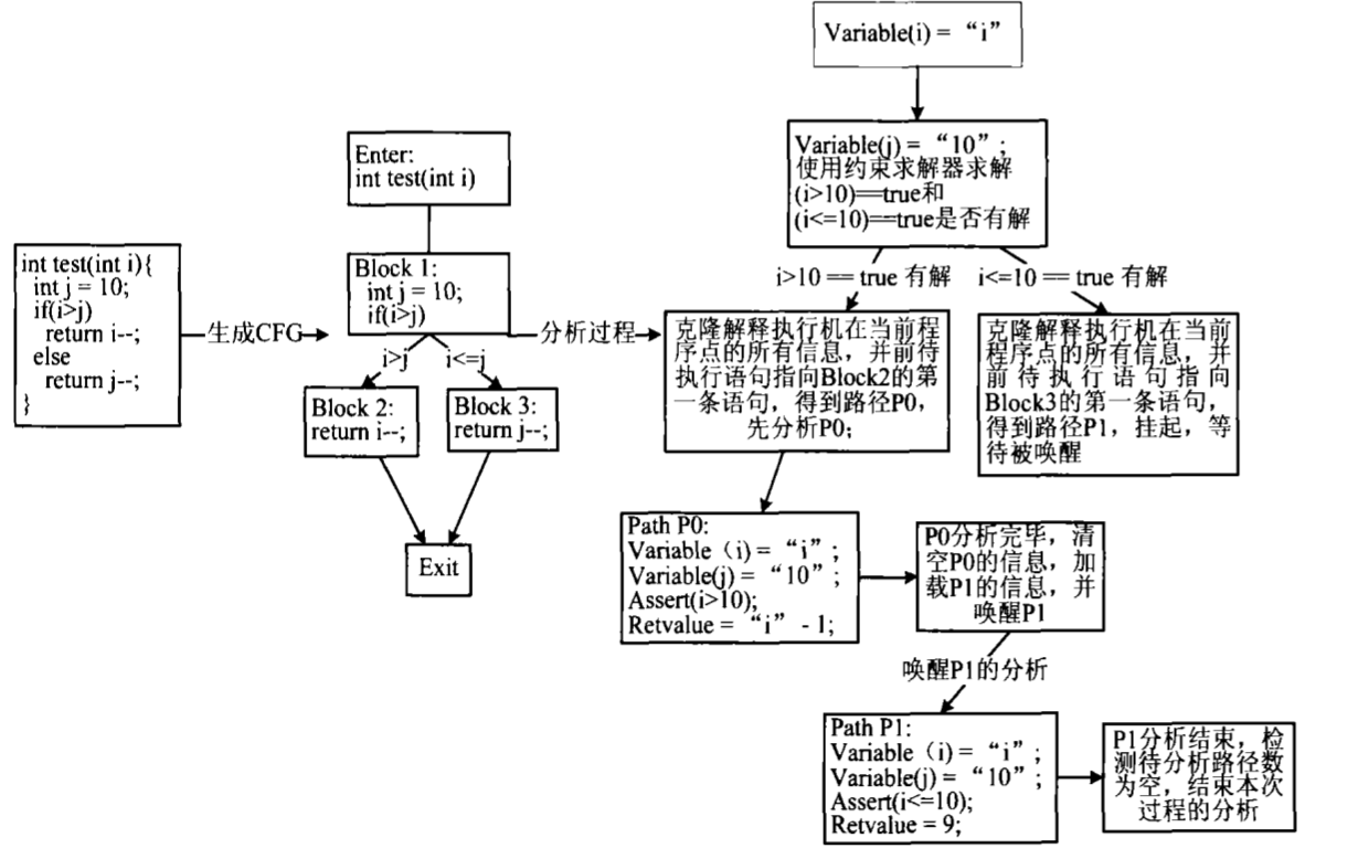 先对一段简单的代码函数test构建控制流图CFG,可以看出该CFG只包含了2条路径。接着,以符号值为输入,模拟执行代码,在遇到分支语句时,使用约束求解器判定这两条路径的可行性,本示例使用的是”深度优先”的路径调度策略。在对两条路径模拟执行并收集路径约束后,使用约束求解器可以求解出分别触发这两条路径的两个测试例输入及对应的返回值。测试例输入为”i = 11”时,返回值”10”;测试例输入为”i = 10”时,返回值为”9”。