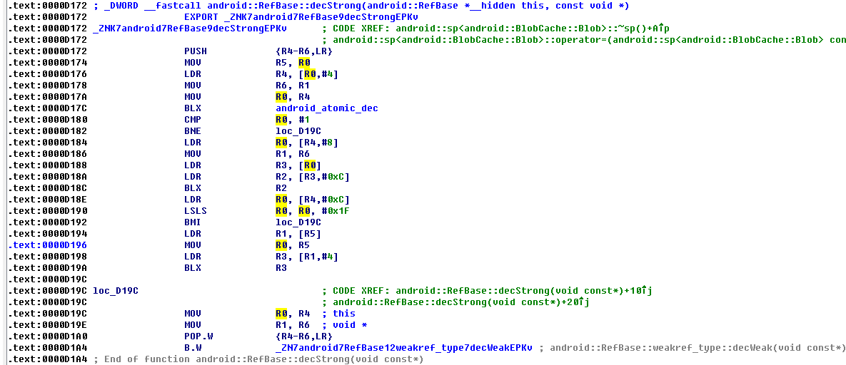 下面看一下发生异常时最后调用的RefBase::decStrong的汇编代码。将/system/lib/libutils.so下载到本地用IDA打开,查看android::RefBase::decStrong函数。(攻击者能控制r0即this指针)