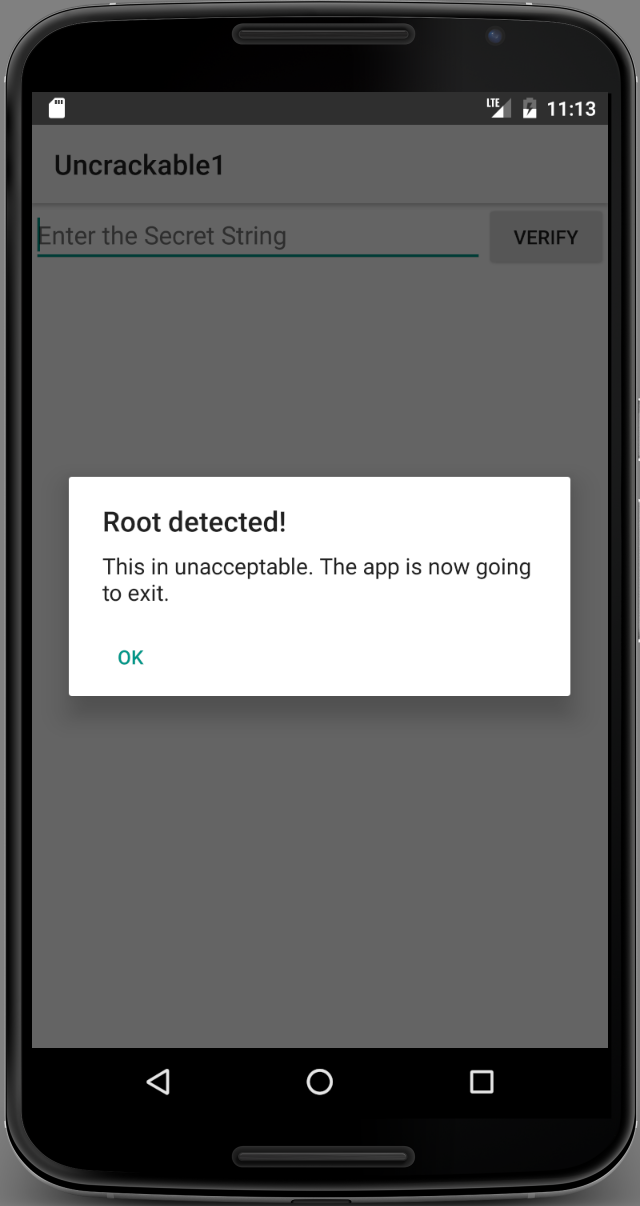 1 2 3 4 5 6 7 8 9 10 11 12 13 14 15 16 17 18 19 20 21 22 23 24 25 26 27 28 29 30 31 32 33 34 35 36 37 38 39 40 41 42 43 44 45 46 package sg.vantagepoint.uncrackable1;import android.app.Activity;import android.app.AlertDialog$Builder;import android.app.AlertDialog;import android.content.Context;import android.os.Bundle;import android.view.View;import sg.vantagepoint.a.c;public class MainActivity extends Activity { public MainActivity () { super (); } private void a (String arg5) { AlertDialog v0 = new AlertDialog$Builder(((Context)this )).create(); v0.setTitle(((CharSequence)arg5)); v0.setMessage("This in unacceptable. The app is now going to exit." ); v0.setButton(-3 , "OK" , new b(this )); v0.setCancelable(false ); v0.show(); } protected void onCreate (Bundle arg2) { if ((c.a()) || (c.b()) || (c.c())) { this .a("Root detected!" ); } if (sg.vantagepoint.a.b.a(this .getApplicationContext())) { this .a("App is debuggable!" ); } super .onCreate(arg2); this .setContentView(2130903040 ); } public void verify (View arg5) { String v0 = this .findViewById(2131230720 ).getText().toString(); AlertDialog v1 = new AlertDialog$Builder(((Context)this )).create(); if (a.a(v0)) { v1.setTitle("Success!" ); v1.setMessage("This is the correct secret." ); } else { v1.setTitle("Nope..." ); v1.setMessage("That\'s not it. Try again." ); } v1.setButton(-3 , "OK" , new sg.vantagepoint.uncrackable1.c(this )); v1.show(); } }