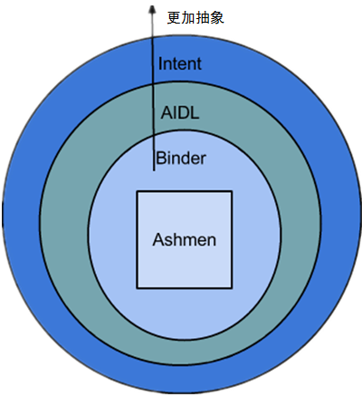 Android将Binder封装的几乎不可见,层次结构如下图: 最底层的是Android的ashmen(Anonymous shared memory)机制,它负责辅助实现内存的分配,以及跨进程所需要的内存共享。AIDL(android interface definition language)对Binder的使用进行了封装,可以让开发者方便的进行方法的远程调用,后面会详细介绍。 Intent是最高一层的抽象,方便开发者进行常用的跨进程调用。 使用Intent跨进程启动一个Activity或者Service是Android中非常基础的内容,这里就不再介绍了。 这里讲一下实现远程的方法调用。在Android中对方法的远程调用无处不在,随便打开framework/base中的包,都会发现很多AIDL文件。AIDL是Android为了方便开发者进行远程方法调用,定义的一种语言。使用AIDL完成一个远程方法调用只需要三个步骤: