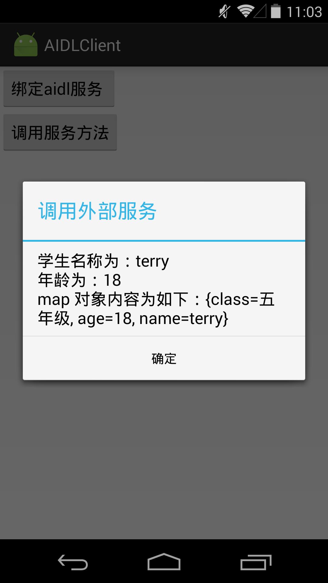 1 2 3 4 5 6 7 8 9 10 11 12 13 14 15 16 17 18 19 20 21 22 23 24 25 26 27 28 29 30 31 32 33 34 35 36 37 38 39 40 41 42 43 44 45 46 47 48 49 50 51 52 53 54 55 56 57 public class MainActivity extends Activity implements View .OnClickListener { Button btn1, btn2; private IMyService myService = null ; private ServiceConnection serviceConnection = new ServiceConnection() { @Override public void onServiceConnected (ComponentName name, IBinder service) { myService = IMyService.Stub.asInterface(service); btn2.setEnabled(true ); } @Override public void onServiceDisconnected (ComponentName name) { myService = null ; btn2.setEnabled(false ); } }; @Override protected void onCreate (Bundle savedInstanceState) { super .onCreate(savedInstanceState); setContentView(R.layout.activity_main); btn1 = (Button) findViewById(R.id.Button01); btn2 = (Button) findViewById(R.id.Button02); btn2.setEnabled(false ); btn1.setOnClickListener(this ); btn2.setOnClickListener(this ); } @Override public void onClick (View v) { switch (v.getId()) { case R.id.Button01: bindService(new Intent("com.example.aidlserver.IMyService" ), serviceConnection, Context.BIND_AUTO_CREATE); break ; case R.id.Button02: StringBuilder sb = new StringBuilder(); try { sb.append("学生名称为:" + myService.getStudent().getName() + "\n" ); sb.append("年龄为:" + myService.getStudent().getAge() + "\n" ); sb.append("map 对象内容为如下:" + myService.getMap("中国" , myService.getStudent()) .toString()); } catch (RemoteException e) { e.printStackTrace(); } new AlertDialog.Builder(MainActivity.this ).setTitle("调用外部服务" ) .setMessage(sb.toString()).setPositiveButton( android.R.string.ok, null ).show(); break ; default : break ; } } }