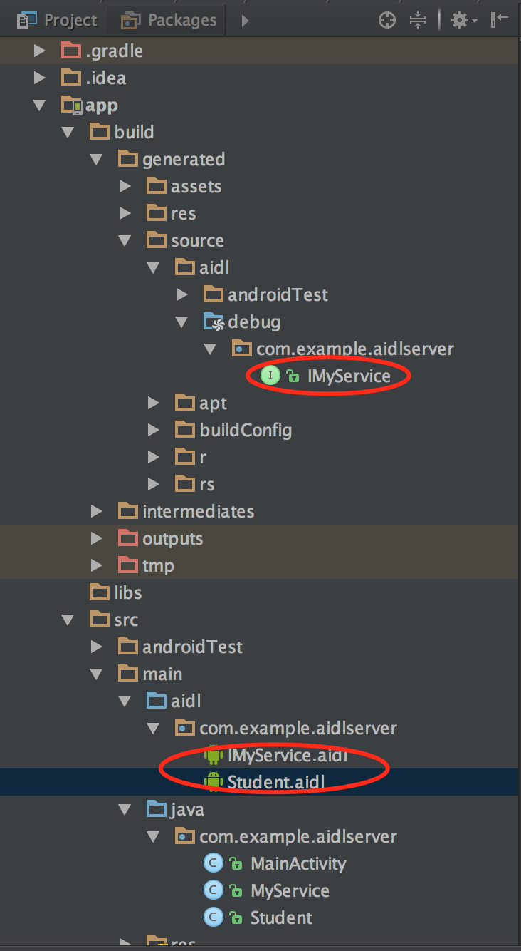 接着新建两个AIDL文件,新建方法是:右键java目录下的包->New->AIDL->AIDL File。这样Android Studio会自动创建一个与java目录同级的aidl目录,aidl目录下有与java目录中相同的包,如上图所示。 新建一个Student.aidl文件: