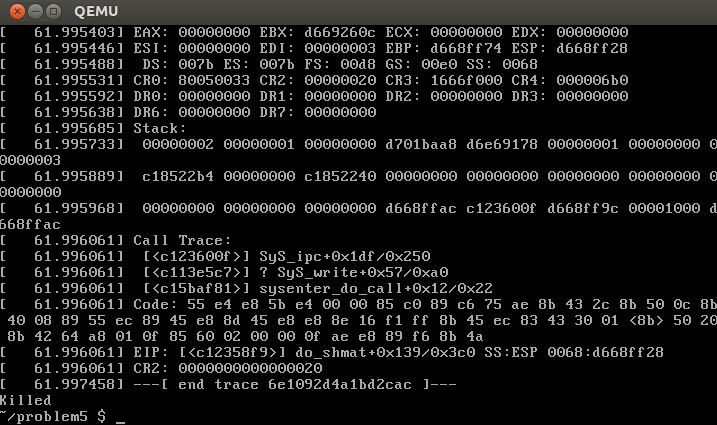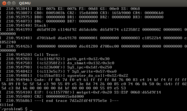 理论上也就会执行attack_address中的指令。但是我覆盖完之后,还没有执行到mmap就出错了,是因为伪造的file缺少内容f_path,导致在do_shmat的path相关的语句读取非法的地址导致内核错误。