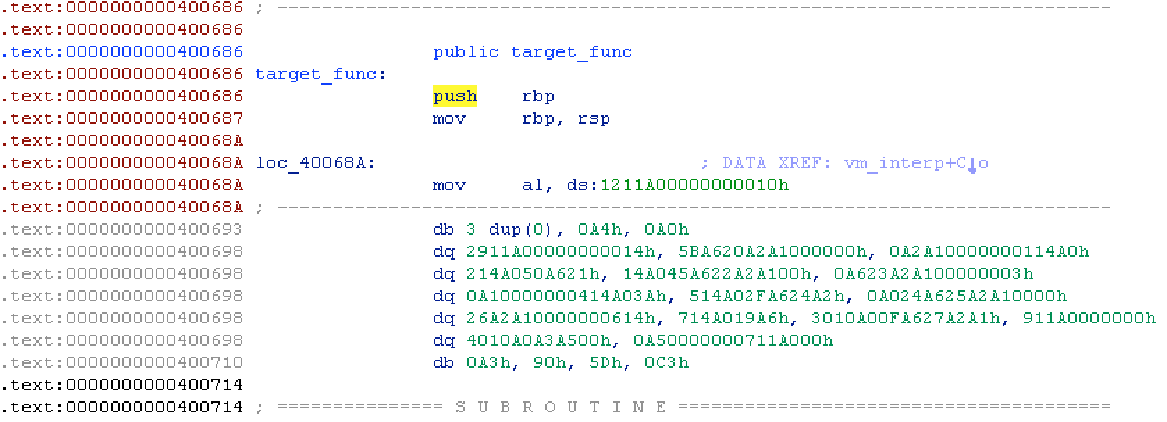 void target_func() { __asm__ __volatile__(".byte 0xa0, 0x10, 0x00, 0x00, 0x00, 0x00, 0xa0, 0x11, 0x12, 0x00, 0x00, 0x00, 0xa4, 0xa0, 0x14, 0x00, 0x00, 0x00, 0x00, 0xa0, 0x11, 0x29, 0x00, 0x00, 0x00, 0xa1, 0xa2, 0x20, 0xa6, 0x5b, 0xa0, 0x14, 0x01, 0x00, 0x00, 0x00, 0xa1, 0xa2, 0x21, 0xa6, 0x50, 0xa0, 0x14, 0x02, 0x00, 0x00, 0x00, 0xa1, 0xa2, 0x22, 0xa6, 0x45, 0xa0, 0x14, 0x03, 0x00, 0x00, 0x00, 0xa1, 0xa2, 0x23, 0xa6, 0x3a, 0xa0, 0x14, 0x04, 0x00, 0x00, 0x00, 0xa1, 0xa2, 0x24, 0xa6, 0x2f, 0xa0, 0x14, 0x05, 0x00, 0x00, 0x00, 0xa1, 0xa2, 0x25, 0xa6, 0x24, 0xa0, 0x14, 0x06, 0x00, 0x00, 0x00, 0xa1, 0xa2, 0x26, 0xa6, 0x19, 0xa0, 0x14, 0x07, 0x00, 0x00, 0x00, 0xa1, 0xa2, 0x27, 0xa6, 0x0f, 0xa0, 0x10, 0x30, 0x00, 0x00, 0x00, 0xa0, 0x11, 0x09, 0x00, 0x00, 0x00, 0xa5, 0xa3, 0xa0, 0x10, 0x40, 0x00, 0x00, 0x00, 0xa0, 0x11, 0x07, 0x00, 0x00, 0x00, 0xa5, 0xa3");
